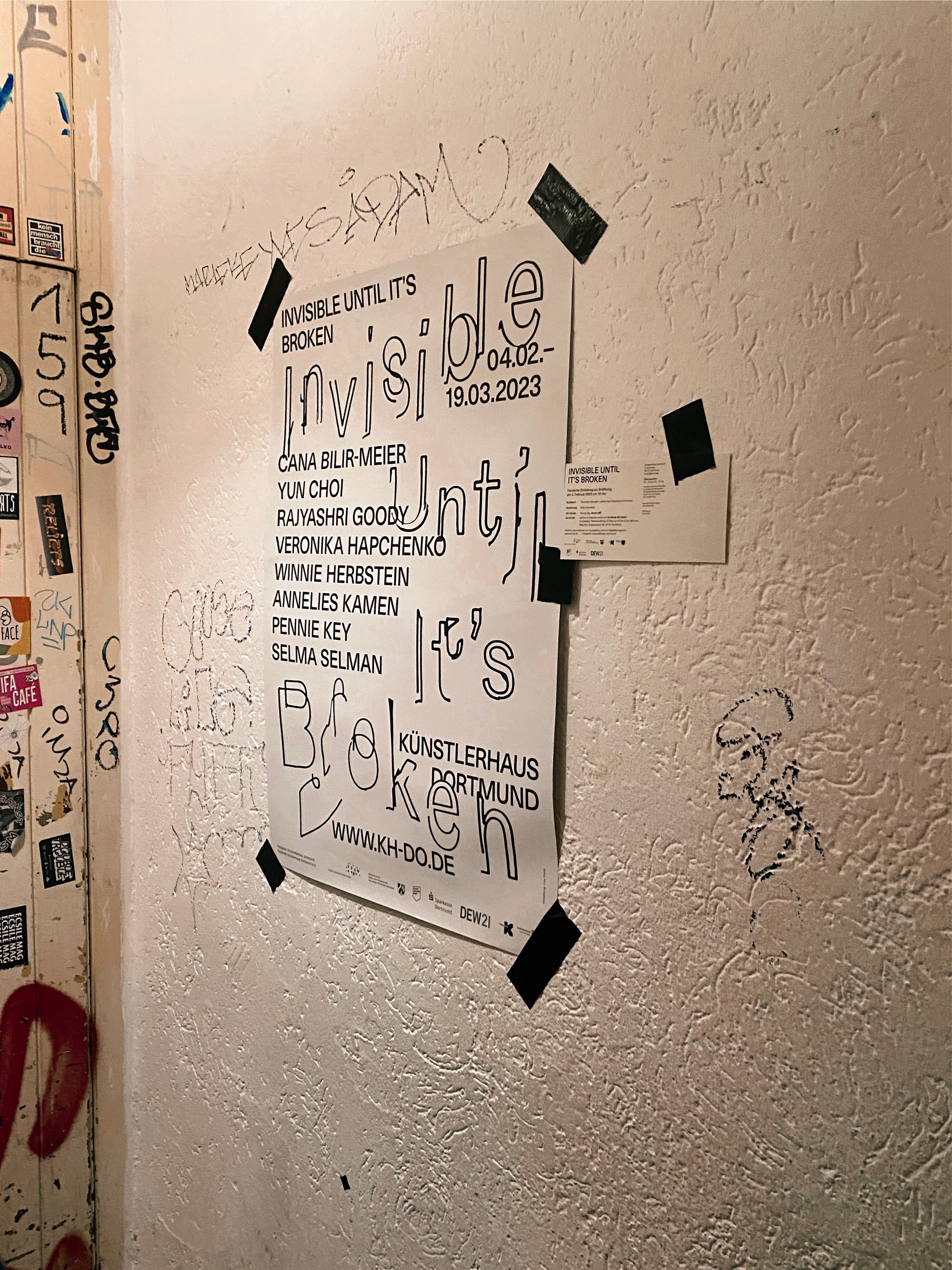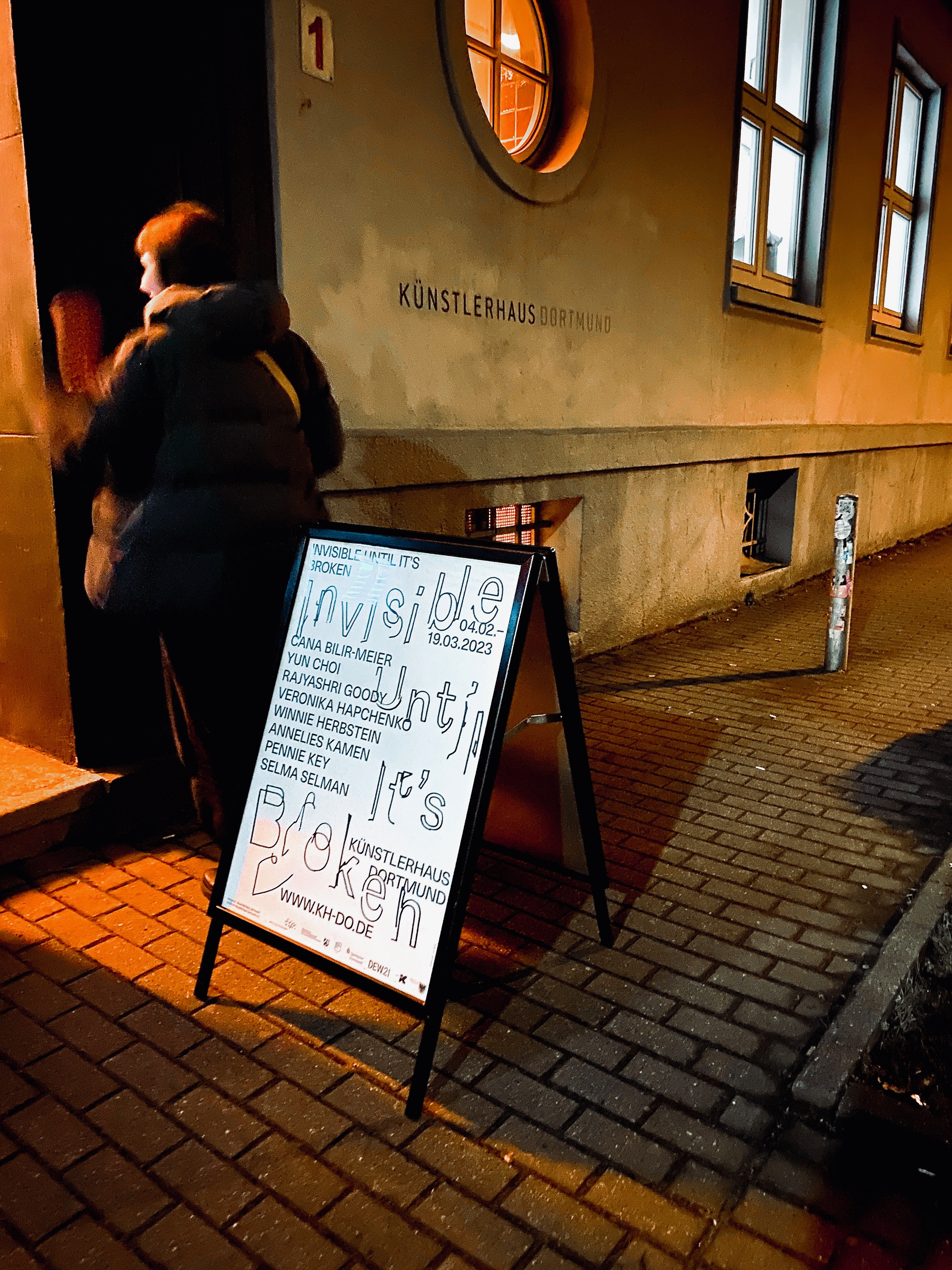 February 2023 ︎︎︎ Do structural problems only become visible when those very structures start to crack? For whom are glass ceilings transparent? Who stares at concrete while looking up? Based on the controversial idea that infrastructures only become visible when they break, the group exhibition Invisible Until It‘s Broken brings together eight spatially expansive installations. With their poetic-political, sometimes playfully humorous perspectives, the artists put their fingers right in the wound. Cracks in social and material infrastructures become palpable.