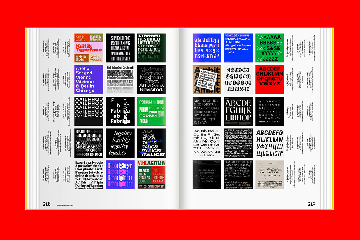 December 2020 ︎︎︎ Support Independent Type is a book about the new culture of type specimens, their impact on design and typographic culture at large. It’s a manifesto for independent type foundries showcasing their work in an effort to promote freshly designed fonts, and why we should support them. An exhibit of over 400 of today’s most adventurous typography labels and designers, showcasing their physical and digital type specimens! The carefully selected collection gives a glimpse into the adventurous shift of this creative industry.