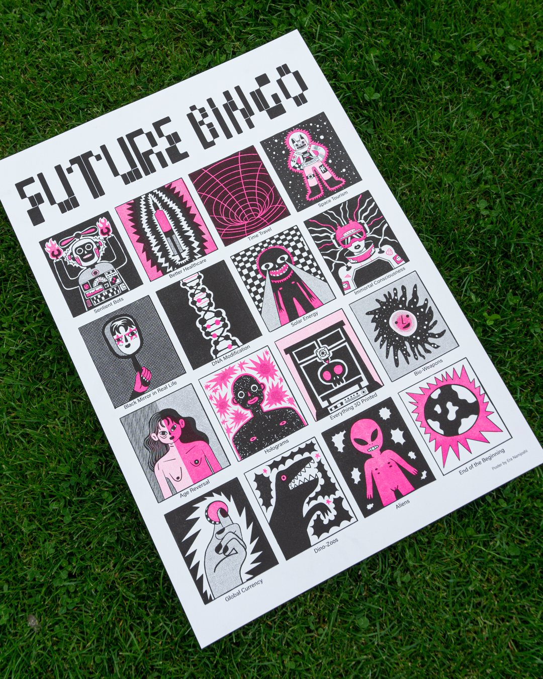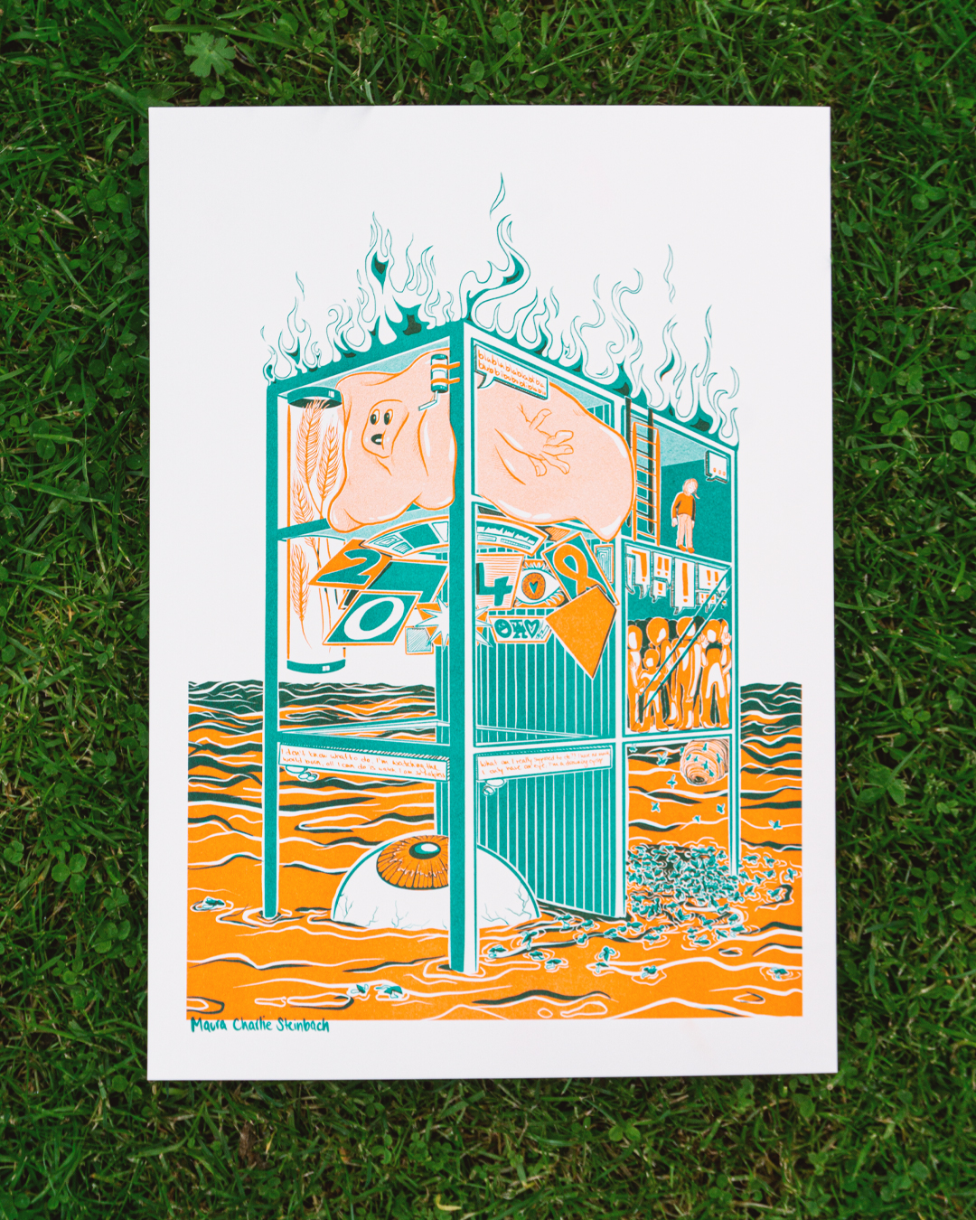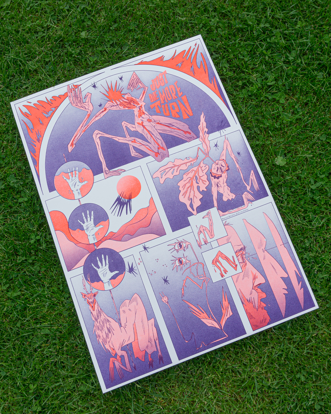In Cooperation with Drucken3000 from Berlin, we offered to print the artworks on the DINA2, A3 and A4 Riso-Printer. Riso-printing is known for its unique texture and vibrant colors, making each print one-of-a-kind.